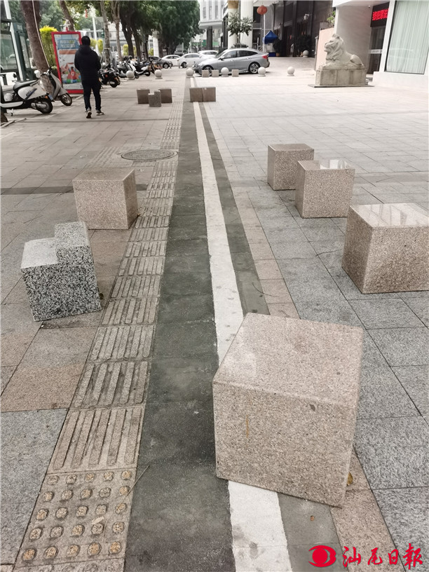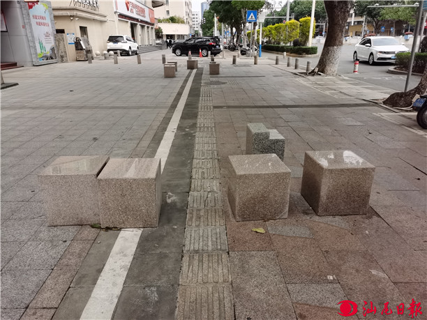 據(jù)市民反映,市區(qū)汕尾大道(中國人壽保險公司附近)有多個石墩擺放在盲道上,存在安全隱患。12月7日,記者在現(xiàn)場看到,石墩放在盲道的引導磚旁邊,盲人朋友沿著引導磚行走的時候很容易被絆倒,希望相關(guān)部門能把石墩挪開,讓盲道通行無阻。