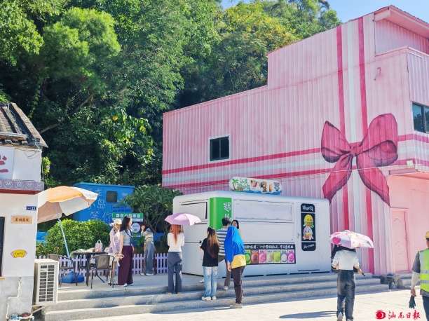 如果說咖啡館是“靜”態(tài)的空間更新,那么水吧街便是“動”態(tài)的文化煥活。2024年5月,原漁船廠員工宿舍僅用三天便完成拆除清理,緊接著又歷時四天完成改造,一座融合海陸豐非遺文化的主題水吧街驚艷亮相,創(chuàng)造了村莊改造的“七日奇跡”。每逢節(jié)假日期間,這里便成了非遺文化的展示舞臺,吹打樂、八音古樂、傳統(tǒng)戲曲伴奏輪番上演,游客手握特色飲品,耳畔是悠揚的百年民樂,眼前是湛藍的碧海藍天,沉浸式體驗非遺文化的獨特魅力?!耙郧翱傆X得老音樂過時,沒想到現(xiàn)在成了吸引游客的招牌!”年輕村民小陳笑著分享自己的觀念轉(zhuǎn)變。