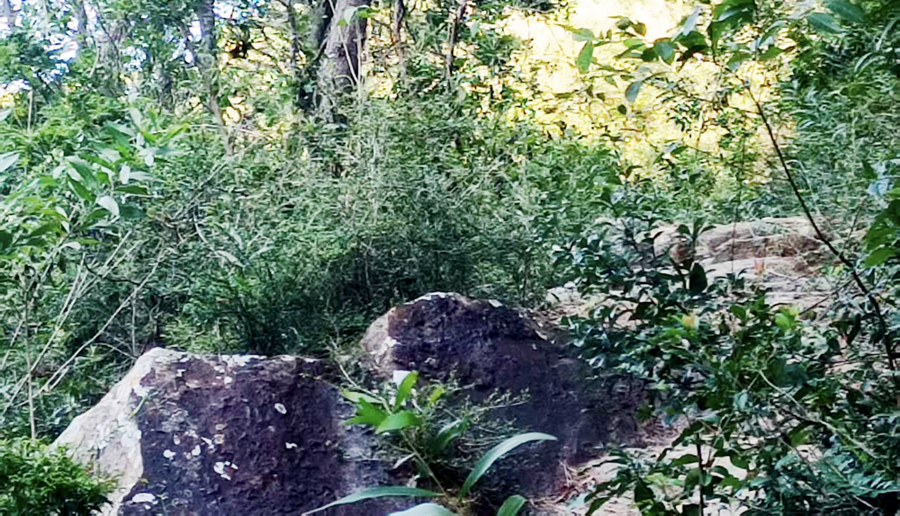 過一條鋪建在峽谷上的小橋來到左側山峰。在一路況崎嶇的羊腸小道,一側是懸崖,另一側是峭壁,左右草本掩蔽,橫柯上蔽,在晝猶昏。小路曲曲彎彎細又長,蜿蜒地伸向大山的密林深處。沿途有亂石,有雜草及帶刺的藤樹,同伴不時提醒要小心,防止滑跌,還輕哼起蘇聯(lián)歌曲《小路》:“一條小路曲曲彎彎細又長,一直通往迷霧的遠方。 我要沿著這條細長的小路,跟著我的愛人上戰(zhàn)場……”歌聲讓我想起黃強、彭鏗、藍訓材等領導工農(nóng)紅軍及赤衛(wèi)隊在這片崇山峻嶺上開展游擊戰(zhàn)爭的革命故事,仿佛遁入光陰的隧道,眼前浮現(xiàn)出電影中紅軍戰(zhàn)士在深山密林行軍作戰(zhàn)的畫面……