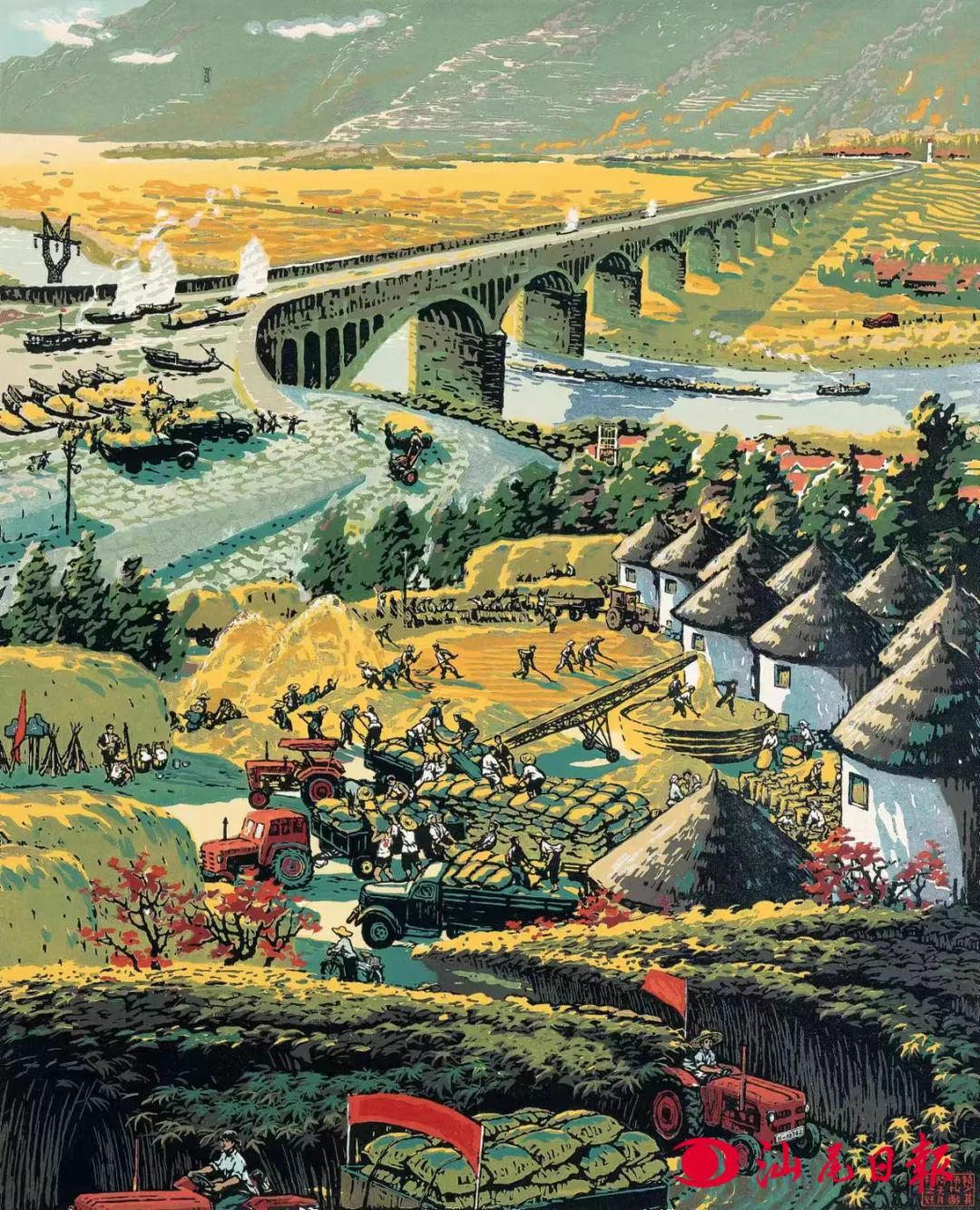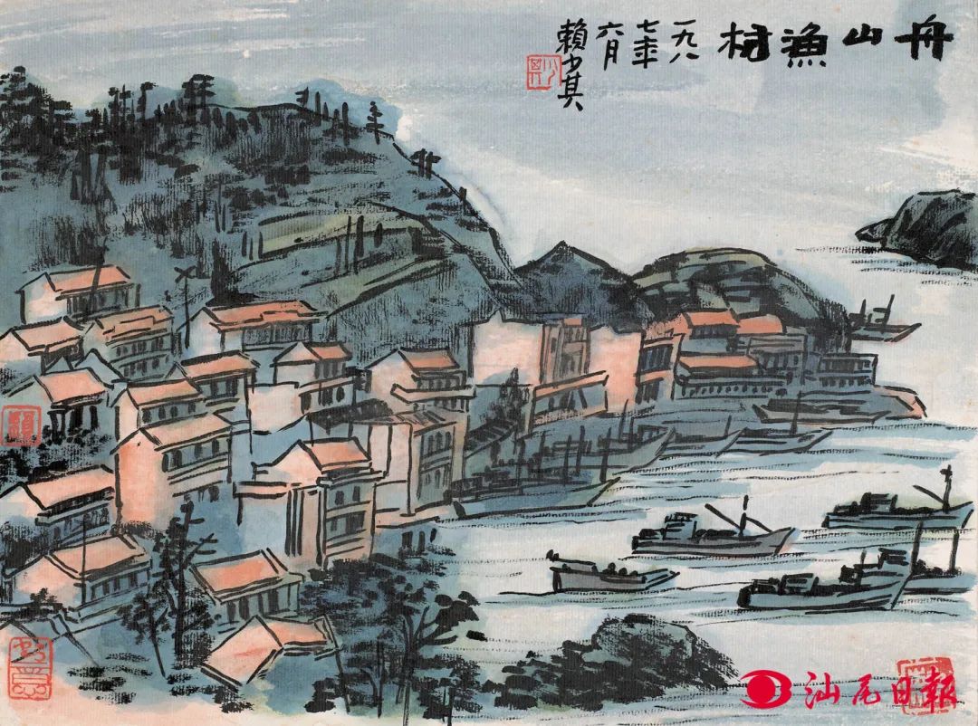 《舟山漁村》筆畫簡約勾勒出口岸熱鬧的景象:在遠處山上依稀可見一小片樹林,下面房屋連片——都是兩三層的小樓房。近處有幾艘漁船靠在岸邊,大概漁民捕魚歸來了。遠處還有四五艘漁船漸漸駛出岸邊,貌似要出海捕魚……從中可見:小小的漁村已改頭換面!漁民靠海吃海,在好政策的支持下,發(fā)揮自己的聰明才智打魚、賣魚,經(jīng)濟好了,住上了“小洋房”!
