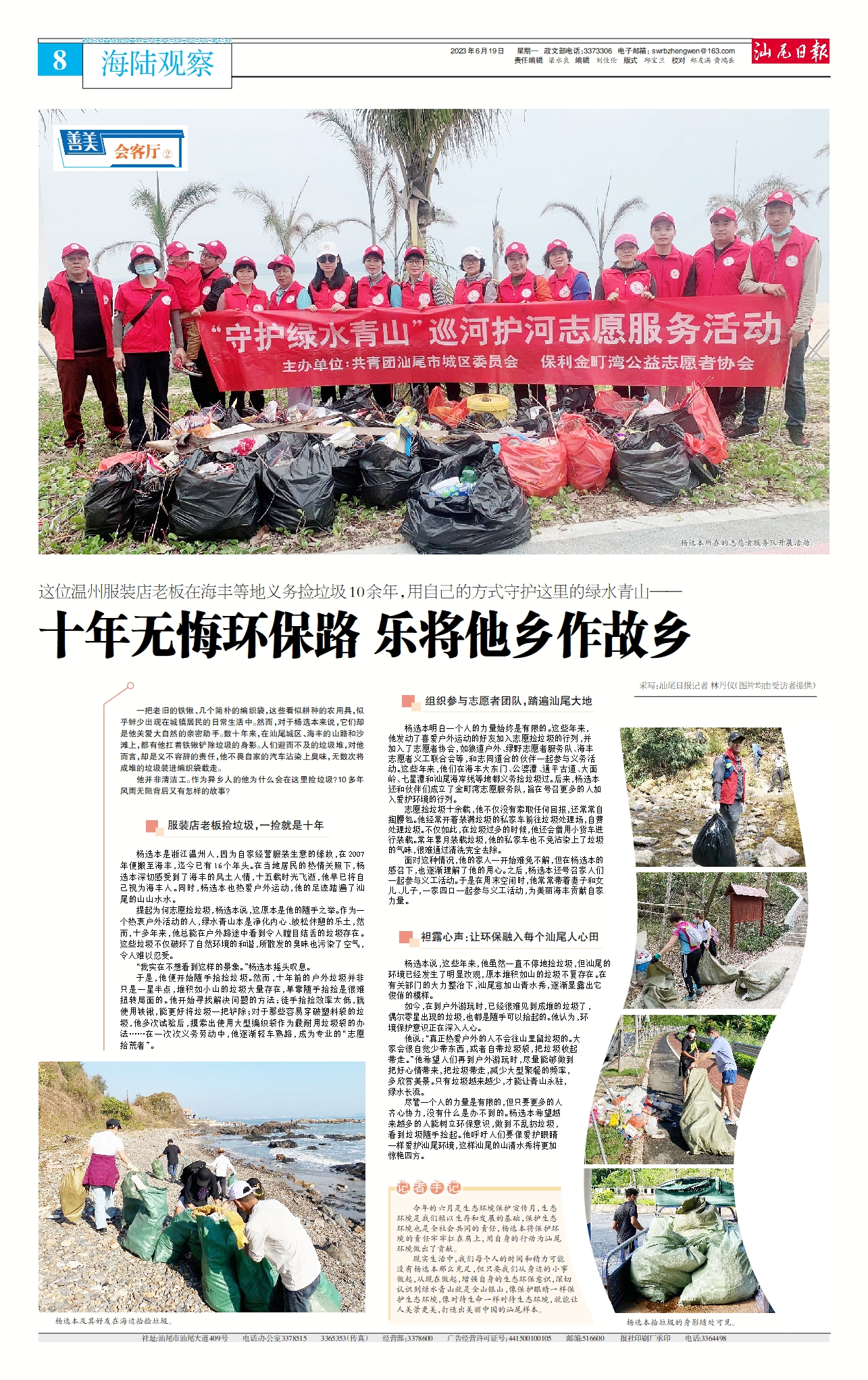 袒露心聲:讓環(huán)保融入每個(gè)汕尾人心田楊選本說,這些年來,他雖然一直不停地?fù)炖?,但汕尾的環(huán)境已經(jīng)發(fā)生了明顯改觀,原本堆積如山的垃圾不復(fù)存在。在有關(guān)部門的大力整治下,汕尾愈加山青水秀,逐漸顯露出它俊俏的模樣。如今,在到戶外游玩時(shí),已經(jīng)很難見到成堆的垃圾了,偶爾零星出現(xiàn)的垃圾,也都是隨手可以拾起的。他認(rèn)為,環(huán)境保護(hù)意識(shí)正在深入人心。他說:“真正熱愛戶外的人不會(huì)往山里留垃圾的。大家會(huì)很自覺少帶東西,或者自帶垃圾袋,把垃圾收起帶走?!彼M藗?cè)俚綉敉庥瓮鏁r(shí),盡量能夠做到把好心情帶來,把垃圾帶走,減少大型聚餐的頻率,多欣賞美景。只有垃圾越來越少,才能讓青山永駐,綠水長(zhǎng)流。盡管一個(gè)人的力量是有限的,但只要更多的人齊心協(xié)力,沒有什么是辦不到的。楊選本希望越來越多的人能樹立環(huán)保意識(shí),做到不亂扔垃圾,看到垃圾隨手撿起。他呼吁人們要像愛護(hù)眼睛一樣愛護(hù)汕尾環(huán)境,這樣汕尾的山清水秀將更加驚艷四方。