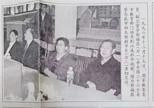 1996年12月17日,時(shí)任國(guó)家教委委員、副總督學(xué)郭福昌(右一)同志帶領(lǐng)全國(guó)26個(gè)省市教育部門領(lǐng)導(dǎo),到校視察,時(shí)任副市長(zhǎng)鄭木勝(右二)陪同視察(資料圖)。