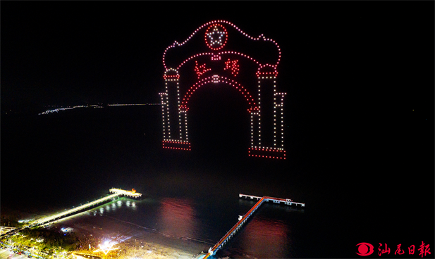 夜幕降臨,華燈初上。當天晚8時,500 架無人機宛如夜空中蘇醒的精靈,依次騰空而起。隨著“星光筑夢 活力汕尾”八個發(fā)光大字率先在蒼穹顯現(xiàn),緊接著,“喜迎十五運會”“沖浪健兒矯健身姿”“栩栩如生藍鯨”等字樣圖形依次亮相,還有紅宮紅場、時遷圖+英歌舞、漁歌圖、白字戲、媽祖像等文化符號閃耀登場,每次無人機造型的變換,都引得市民游客陣陣歡呼,紛紛舉起手機拍照留念。整個無人機匯演持續(xù)了約20分鐘,在這短暫卻又令人難忘的時間里,汕尾的獨特魅力通過夜空的光影表演,被淋漓盡致地展現(xiàn)在眾人面前。