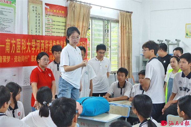 圖為服務(wù)隊(duì)隊(duì)員在指導(dǎo)學(xué)生練習(xí)胸外按壓。