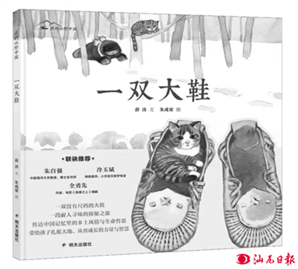 這是兒童文學(xué)作家薛濤與畫家朱成梁新近創(chuàng)作的圖畫書《一雙大鞋》的結(jié)尾。天空地白,雪道延展,兩聲“再見”里,是一段遙遠(yuǎn)的童年;兩聲“再見”里,有一份對(duì)故鄉(xiāng)的懷念之情。