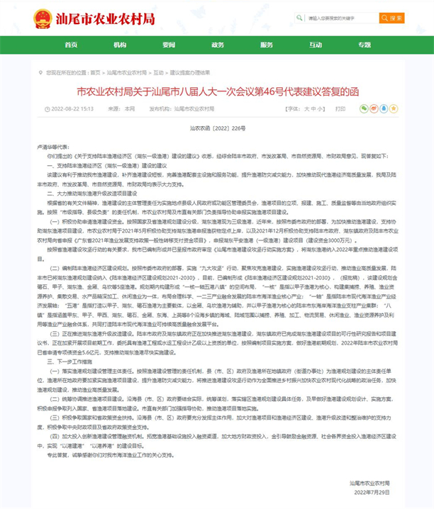 市農(nóng)業(yè)農(nóng)村局關(guān)于人大代表《關(guān)于支持陸豐漁港經(jīng)濟(jì)區(qū)(湖東一級漁港)建設(shè)的建議》回復(fù)函。