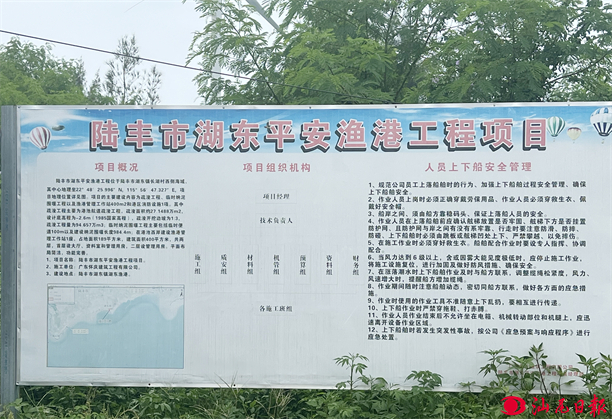 湖東漁港岸邊設(shè)立的湖東平安漁港工程項(xiàng)目介紹牌。