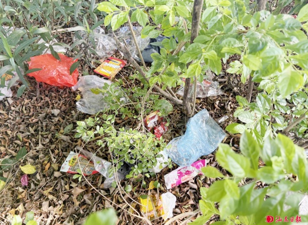記者看到,公園入口處植被茂盛,生態(tài)環(huán)境總體良好。但深入內(nèi)部后,問題逐一顯現(xiàn):綠化帶中散落著零食袋、礦泉水瓶、果皮等生活垃圾,部分角落堆積嚴重;入口廣告牌漆面斑駁、破損不堪;園內(nèi)標識牌東倒西歪,方向指示牌內(nèi)容缺失,給游客帶來不便;木棧道地板和休閑座椅也存在不同程度的破損。