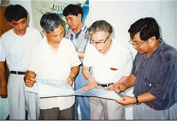 彭士祿(右二)與科研人員討論工作(資料照片)。