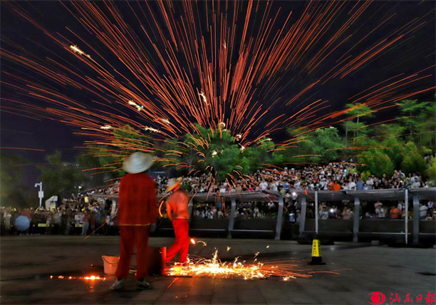 9月13日晚,絢麗的煙花拉開海豐中秋花火大會序幕。次日晚,由“火”元素構(gòu)成的非遺打鐵花、風(fēng)火輪、非遺火壺、火焰刀、火棍節(jié)目輪番登場,吸引眾多市民游客駐足觀看。聽說有非遺打鐵花表演,攝影愛好者陳先生連忙趕到現(xiàn)場拍攝?!芭臄z非遺打鐵花的市民、攝影師及攝影愛好者很多,為了抓拍到好看的畫面,我只能不斷地移動位置”。在現(xiàn)場忙碌拍攝的陳先生說。
